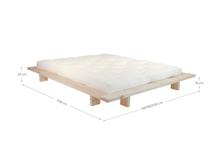 Puoi usare dei tatami ribassati (non inclusi nel prezzo) sopra le doghe per avere una base su cui poggiare il futon. Il futon acquistato potrà essere delle stesse dimensioni dell'interno letto, un po' più grande andando a coprire parte del giroletto in legno, oppure un po' più piccolo, in modo da far vedere i tatami.
