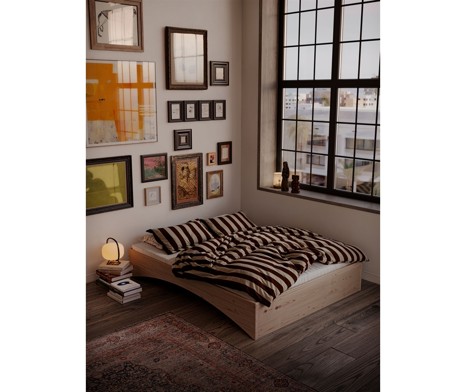La sua struttura unisce la semplicità delle linee geometriche alla leggerezza della curva arcuata ai due laterali del letto. Si caratterizza per la struttura solida e gli angoli arrotondati.